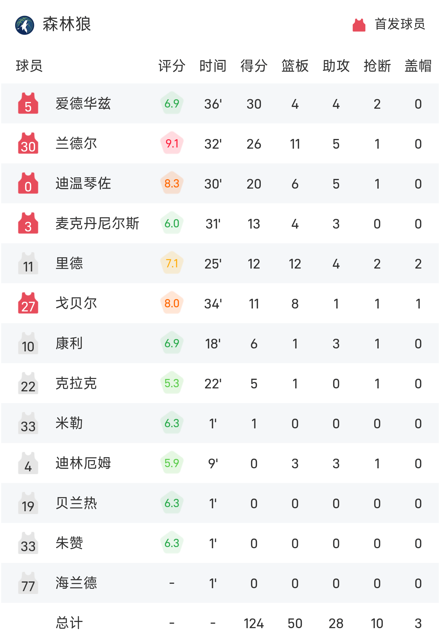 双方全场战罢,森林狼124-110战胜国王。