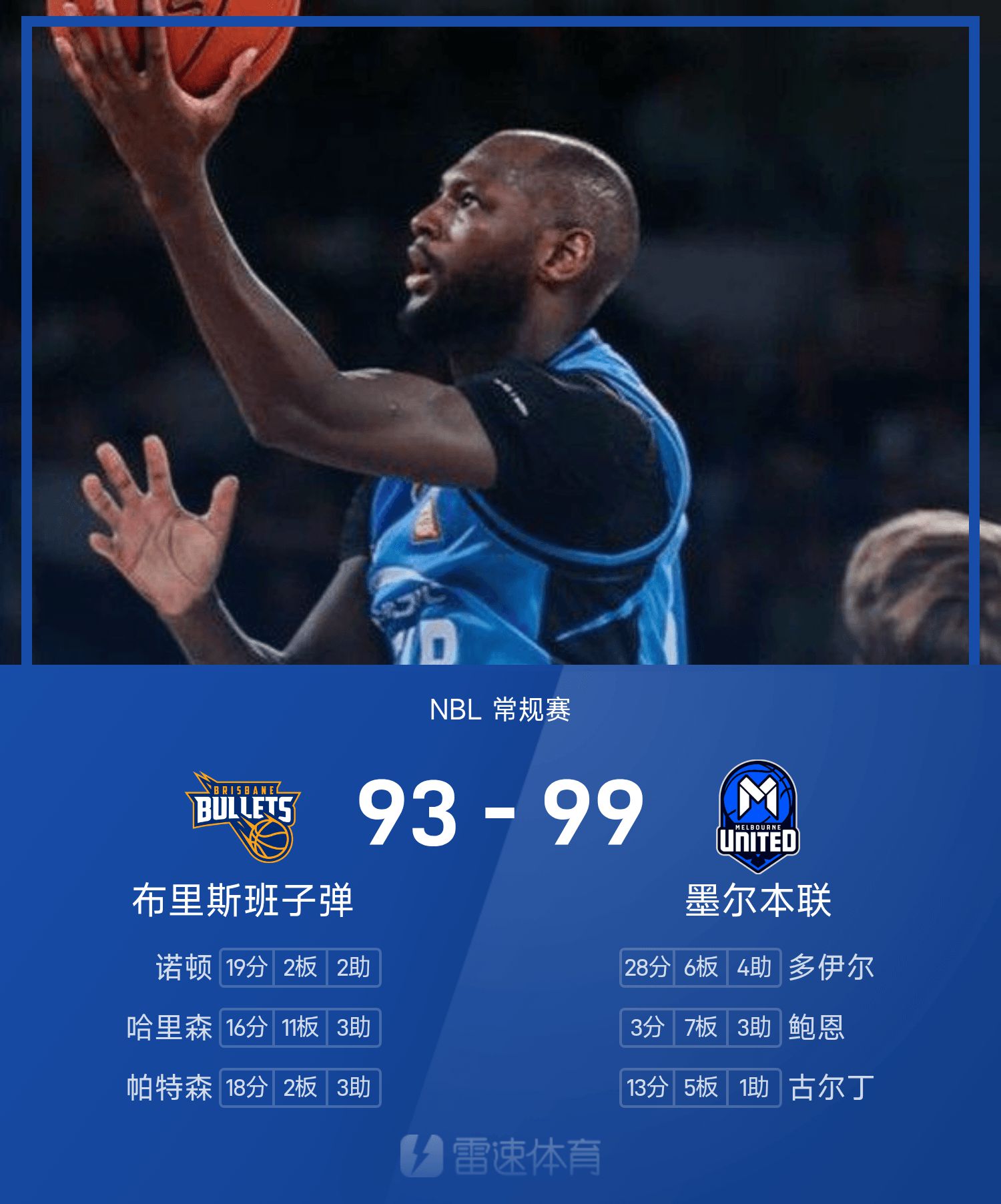 NBL战报:多伊尔28分6板,墨尔本联99-93击败布里斯班子弹
