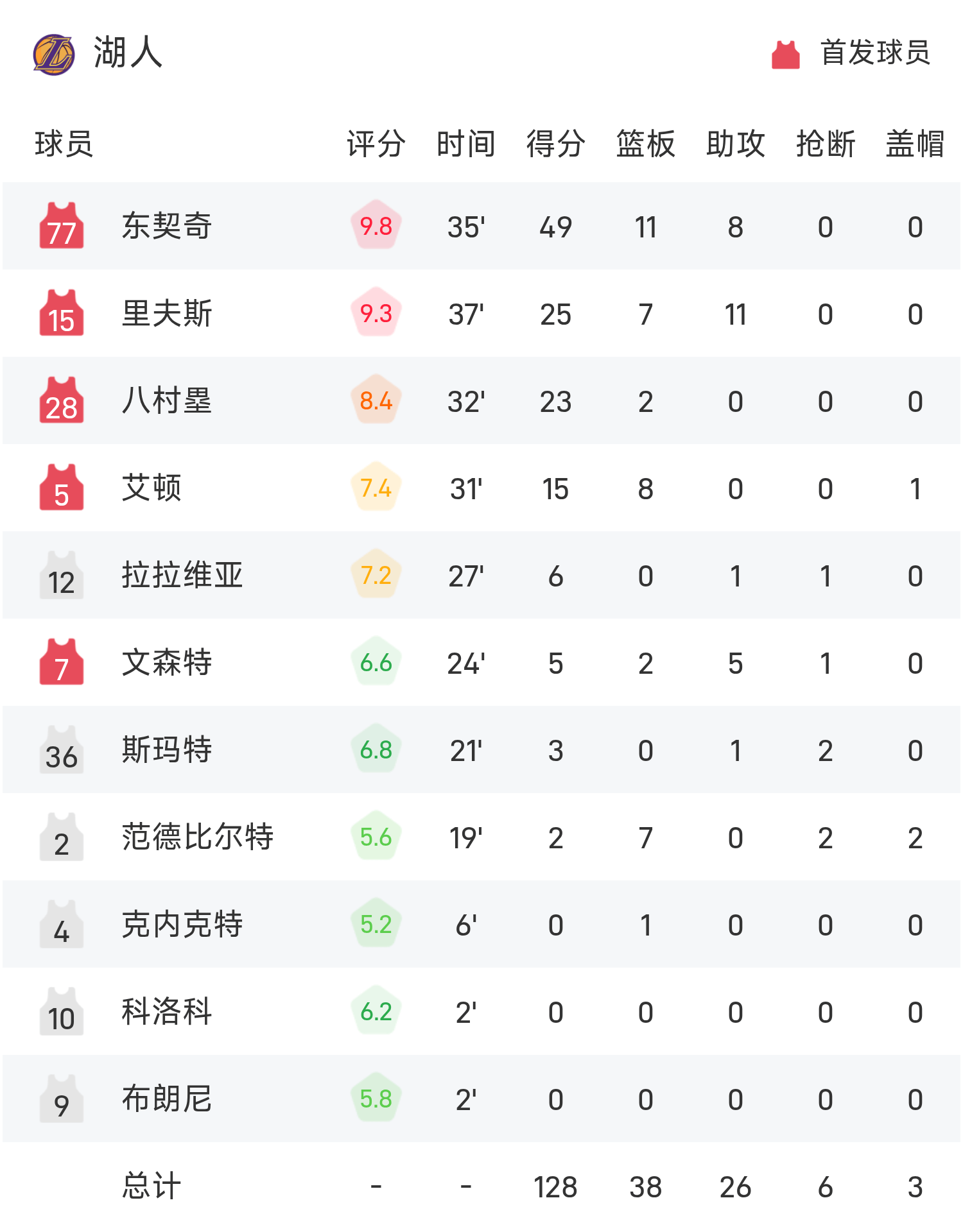 6686体育10月25日讯 25/26赛季NBA 常规赛,湖人对阵森林狼。双方全场战罢,湖人128-110战胜森林狼。东契奇砍下全场最高的49分11板8助,率领湖人胜利取胜。