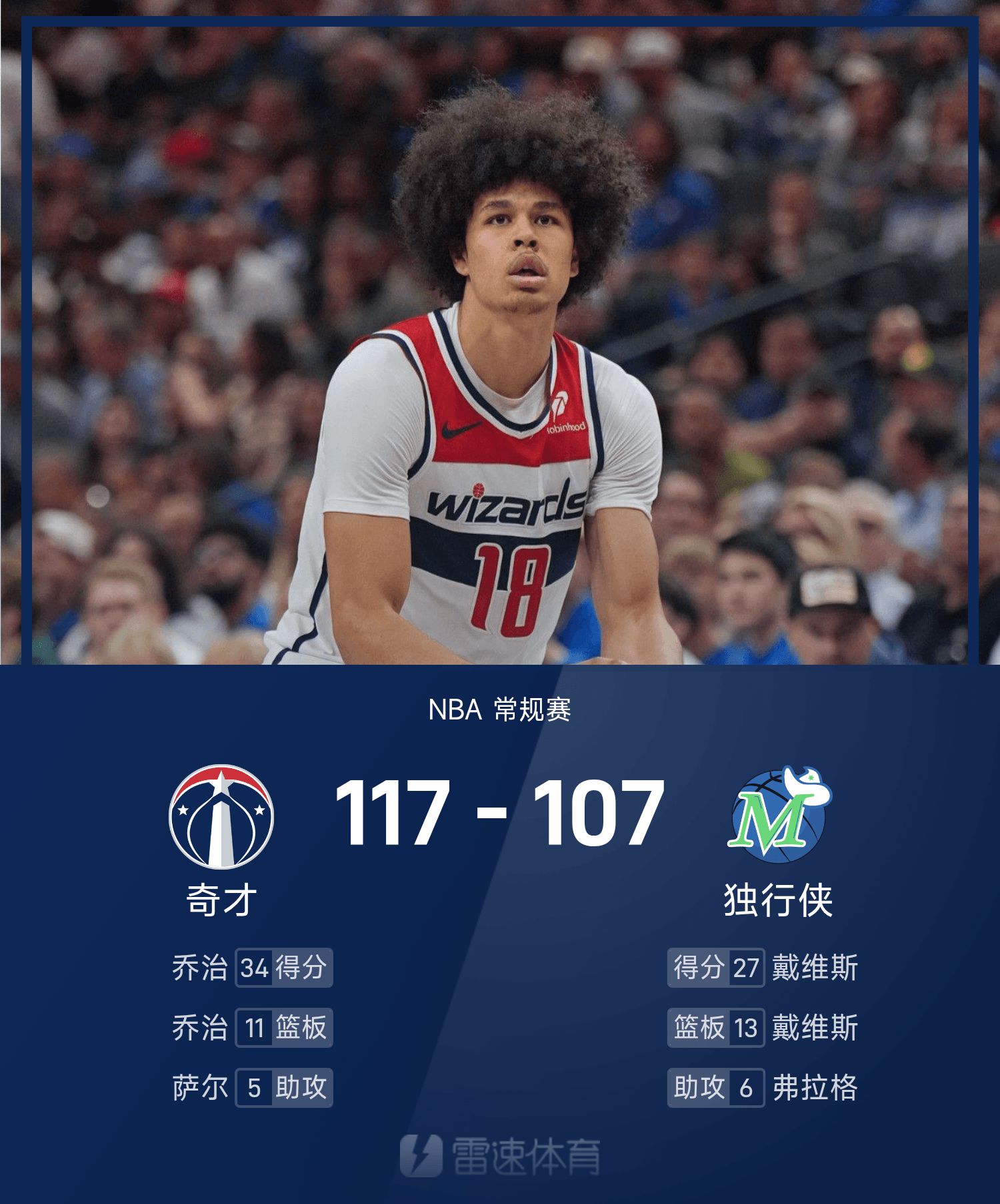 6686体育10月25日讯 25/26赛季NBA 常规赛,独行侠对阵奇才。双方全场战罢,独行侠107-117不敌奇才。乔治砍下全场最高的34分11板4助,率领奇才胜利取胜。