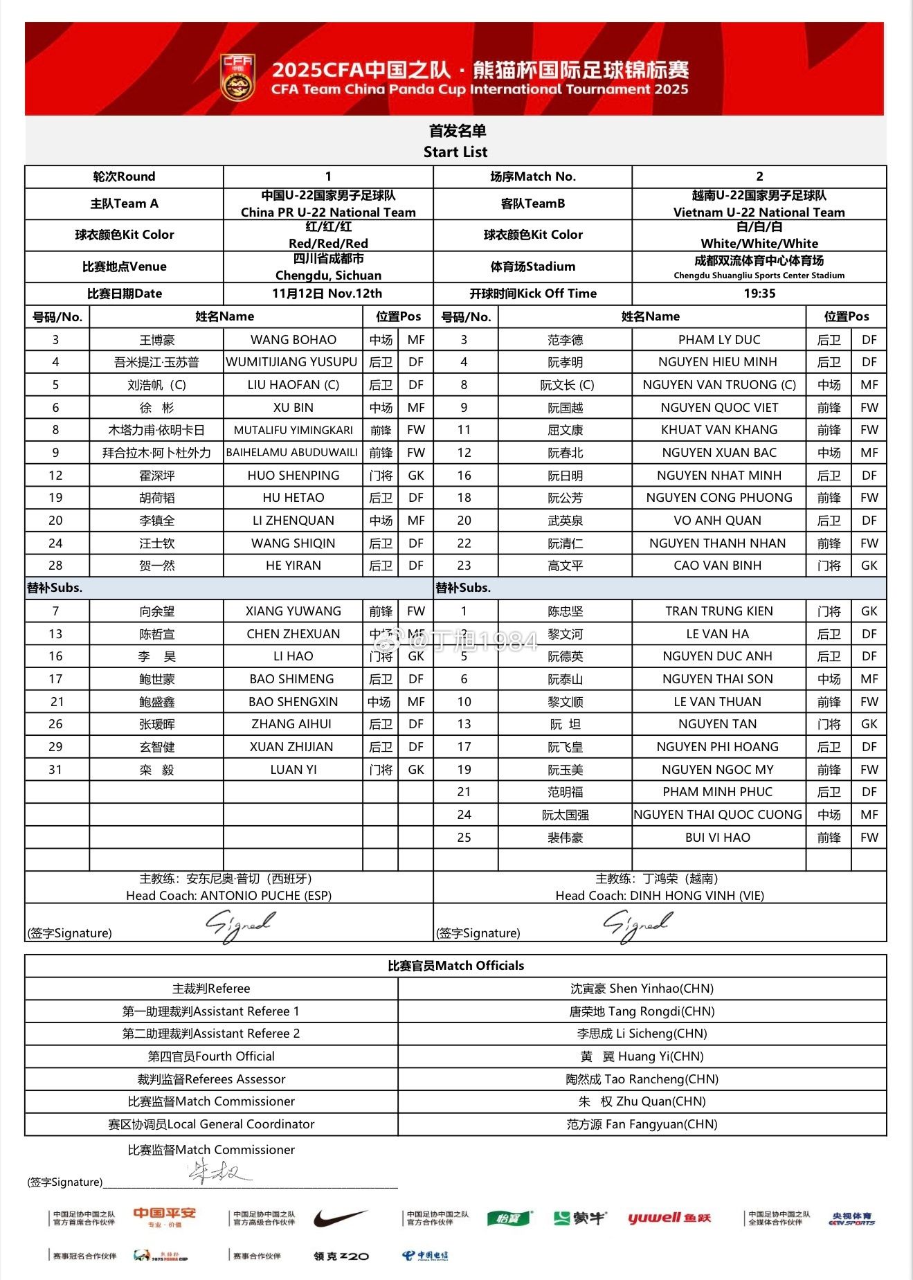 北京时间11月12日晚19:35,2025年熊猫杯国际足球冠军赛,中国U22男足在成都双流体育中心体育场对阵越南U22,赛前双方首发公布,现效力于荷乙联赛事邓伯什队的小将王博豪出战。