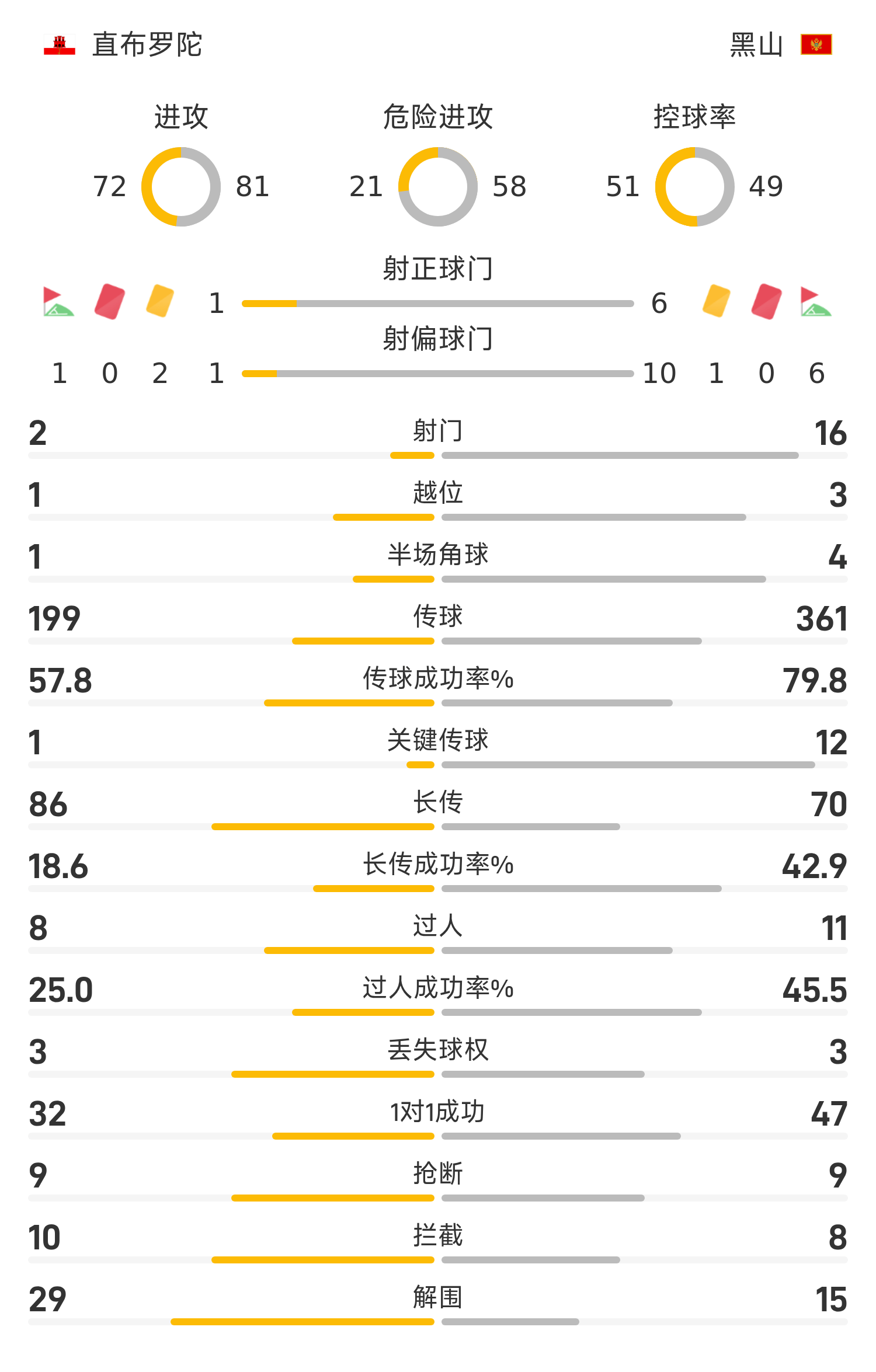 黑山首发阵容:13-尼基奇、3-拉杜诺维奇(46’16-佩罗维奇)、23-马鲁西奇、15-西普契奇(77’5-鲁贝季奇)、6-图奇、8-扬科维奇(74’14-布尔诺维奇)、11-伍克提奇、10-阿季奇(66’19-隆卡尔)、21-布拉托维奇、9-科斯托维奇(74’17-久卡诺维奇)、20-奥斯马吉