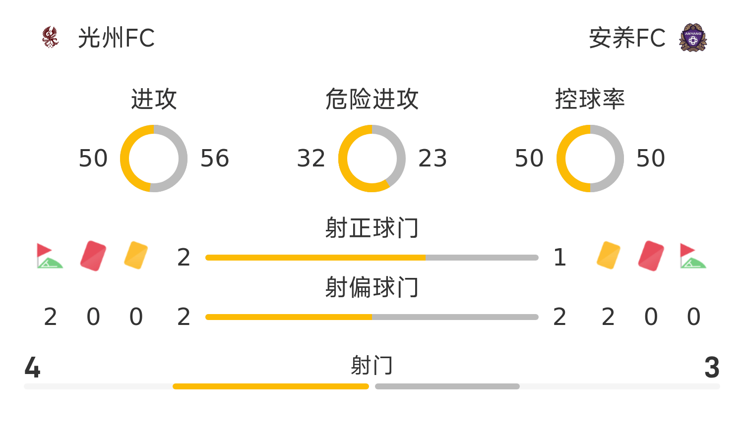 光州FC首发阵容:1-金耿民、94-沈相旼、5-卞俊洙、2-赵诚权、20-进时宇、10-崔庆绿、18-朴仁赫、8-李刚玹、16-郑支训、17-雷斯、40-申昶武