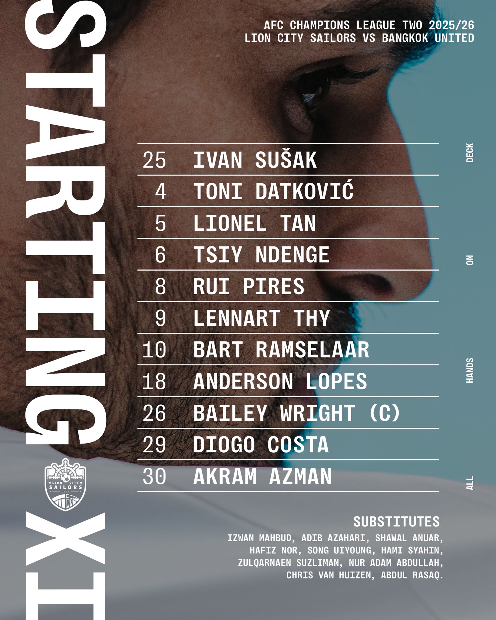 狮城水手首发:25-苏萨克、26-赖特、4-达特科维奇、5-陈汉伟、29-科斯塔、9-蒂伊、10-拉姆塞拉尔、6-恩登格、8-皮雷斯、30-阿兹曼、18-洛佩斯