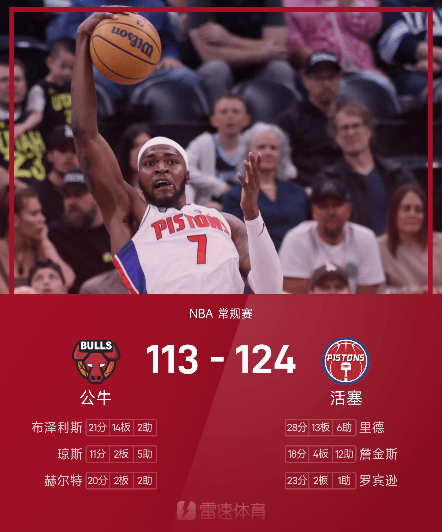 双方全场战罢,活塞124-113战胜公牛。