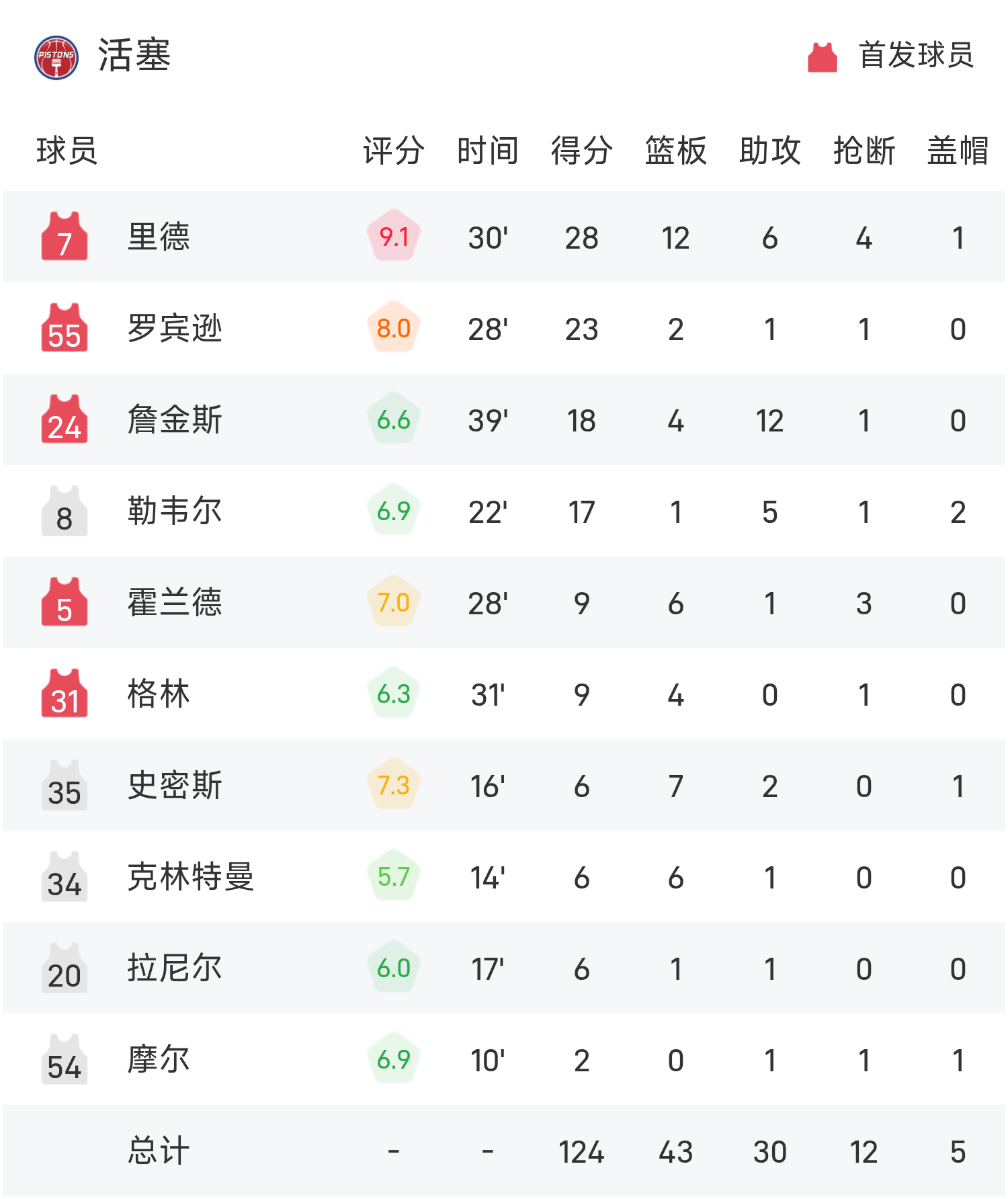 里德砍下全场最高的28分12板6助,率领活塞胜利取胜。