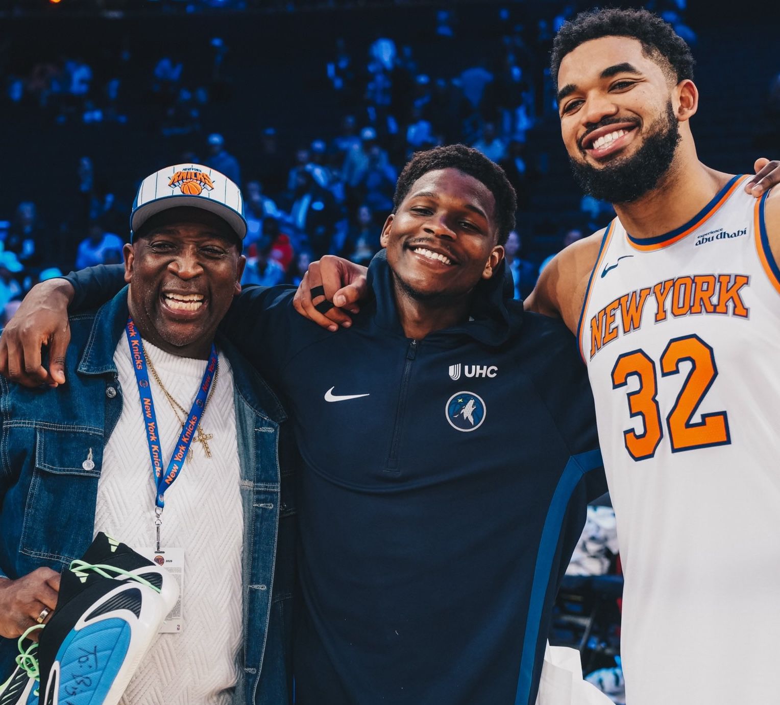 赛后,爱德华兹与唐斯以及他的父亲合影留念,爱德华兹还送给唐斯父亲自己的亲签篮球鞋。